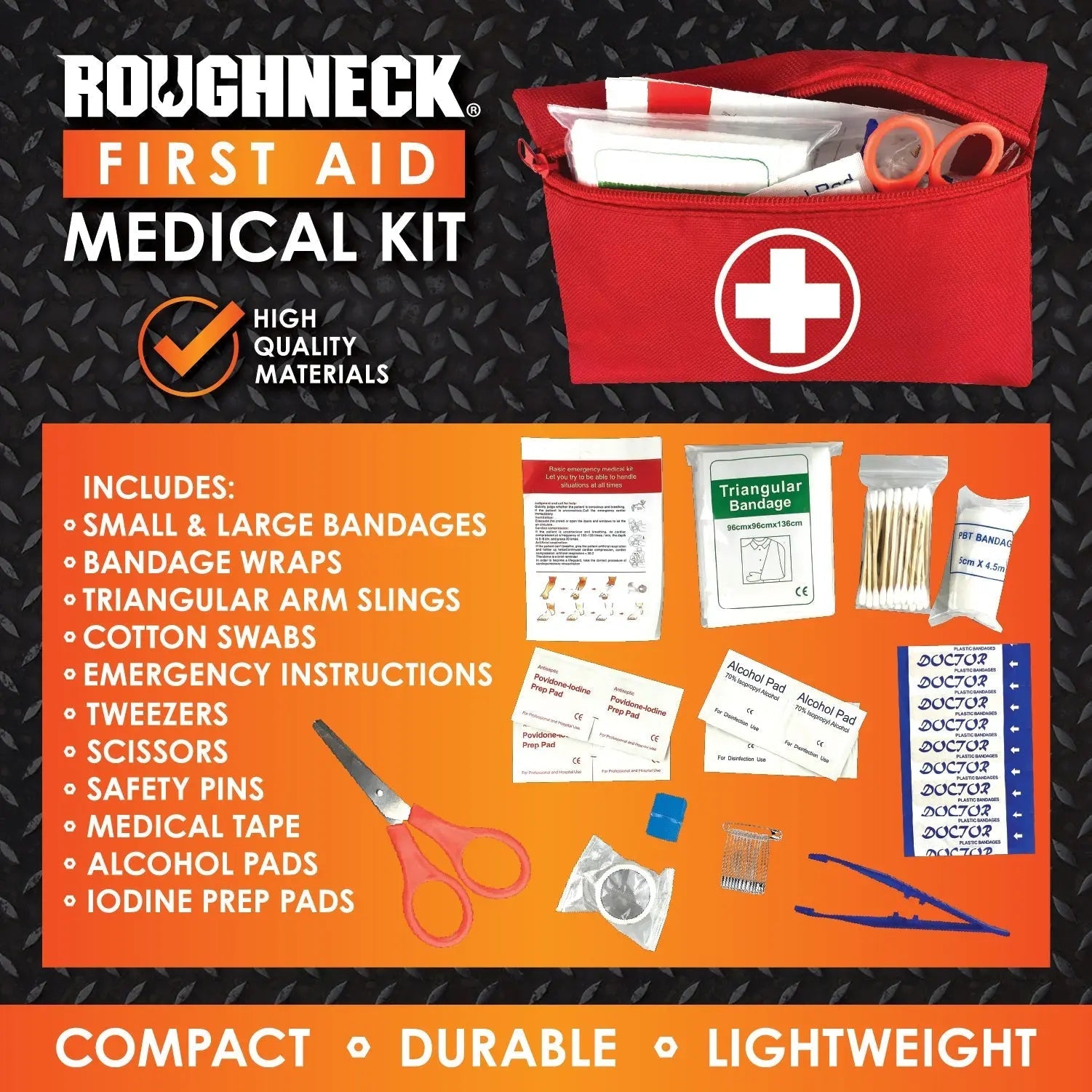This Roughneck First Aid Kit is a compact, durable, and lightweight solution designed for quick and effective medical response. Crafted from high-quality materials, it includes essential items such as small and large bandages, bandage wraps, triangular arm slings, cotton swabs, emergency instructions, tweezers, scissors, safety pins, medical tape, alcohol pads, and iodine prep pads. Ideal for workplaces or on-the-go use, this kit ensures you are prepared to handle minor injuries with confidence and care.