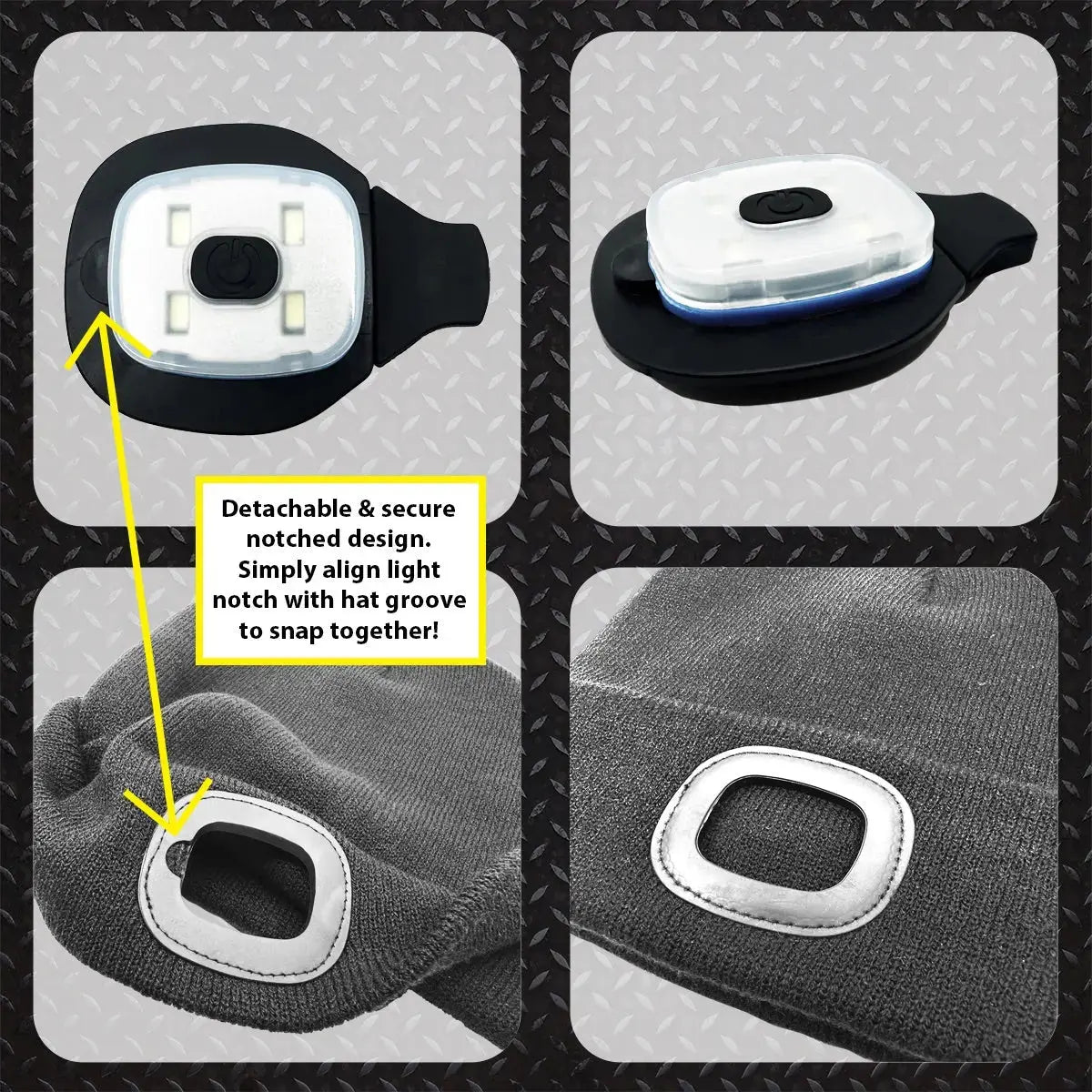 These Halloween LED hats are comfortable, cute, fashionable, and are great for seeing in the dark! Features exclusively secure notched design — simply align the light's notch with the hat's groove, then snap together! Detachable USB light requires ZERO CABLES. Simply remove the COB LED light from your hat and directly charge via any USB port. The display has two of each design.