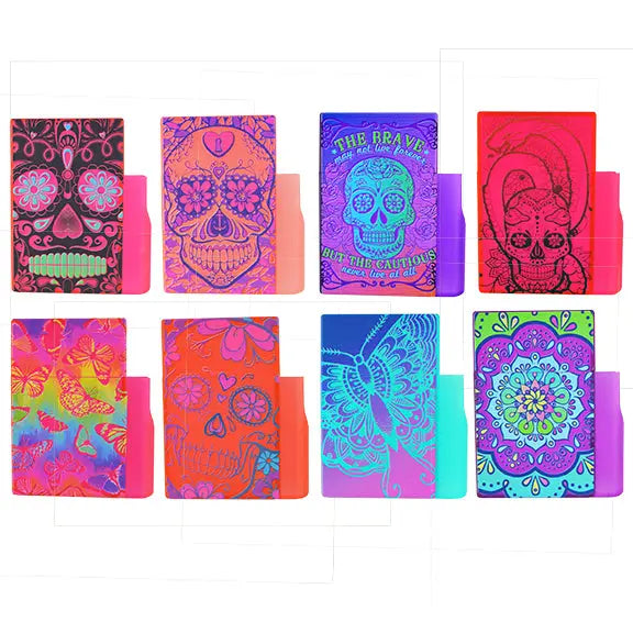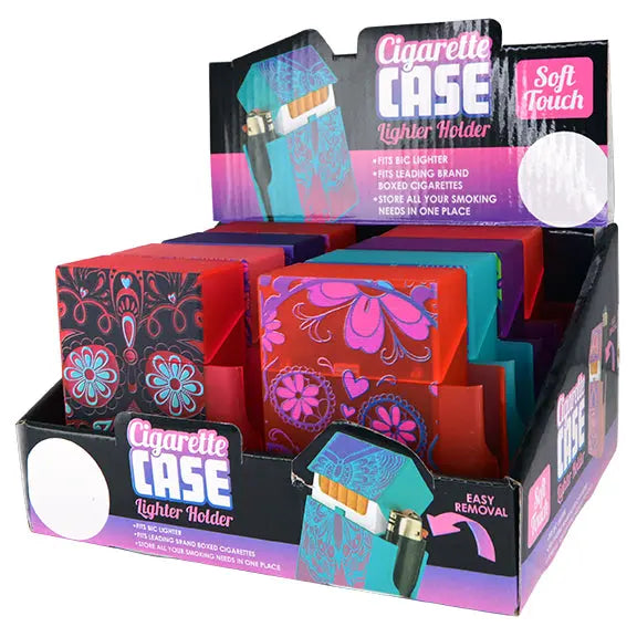 Soft touch cigarette box with built in lighter holder. Cigarette box designed to fit regular sized cigarette boxes. Lighter holder designed to fit bic lighters. Comes in assorted printed styles.