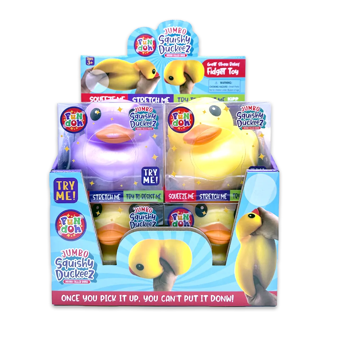 Introducing Fun Doh Jumbo Squishy Duckeez- the ultimate stress relief fidget toy! These dough filled ducks are perfect for squeezing and stretching, providing endless fun and relaxation. Once you pick one up, you won't want to put it down!
