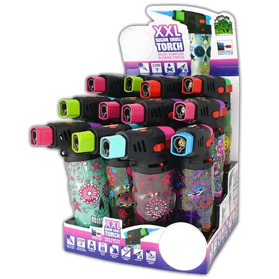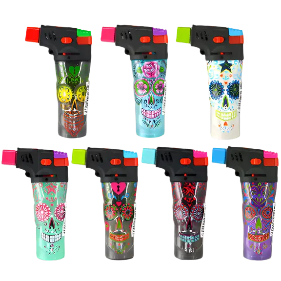 Refillable XXL style torch lighter with molded sugar skull designs. Has 2300° flame, strong enough for any task! Great for camping, bronzing metal, soldering wires, flaming food, and more! Comes with a safety lock and in assorted colors and designs.