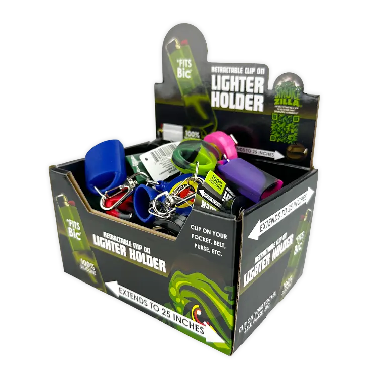 Retractable clip on lighter holder has soft silicone holder made to fit BIC and similarly shaped lighters. Clip works great to attach to pocket, belt, purse, etc. Extends to 25 inches! Assorted colors.