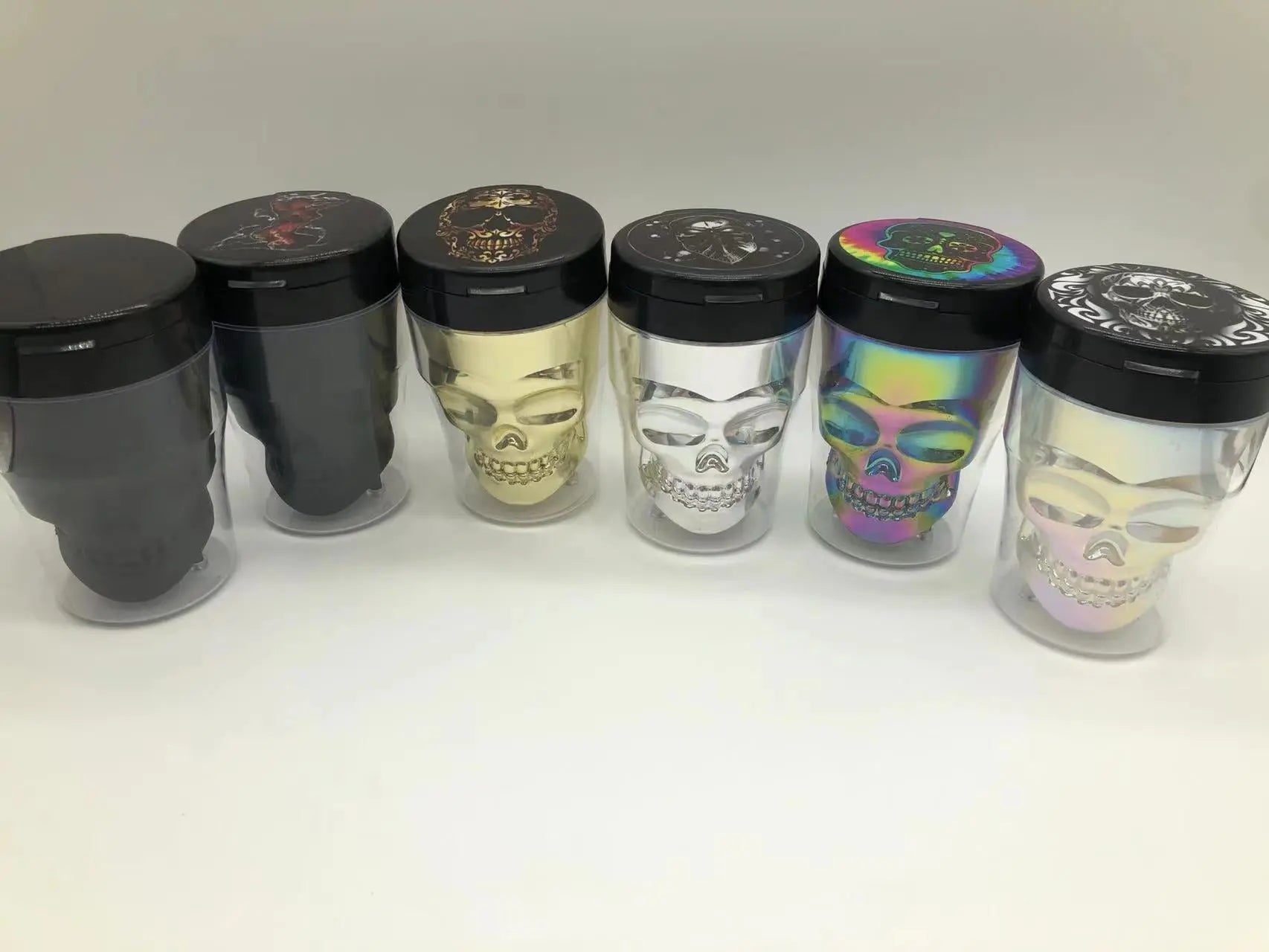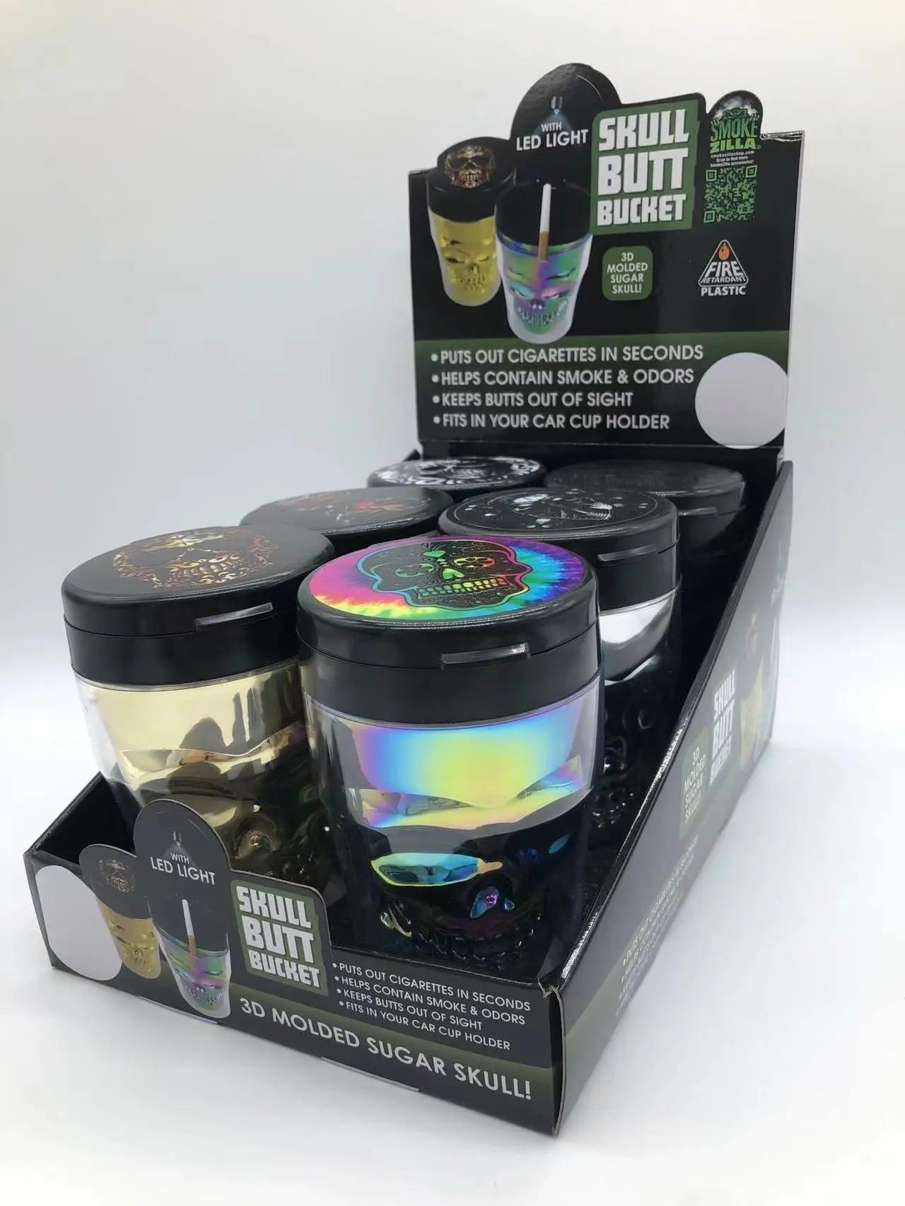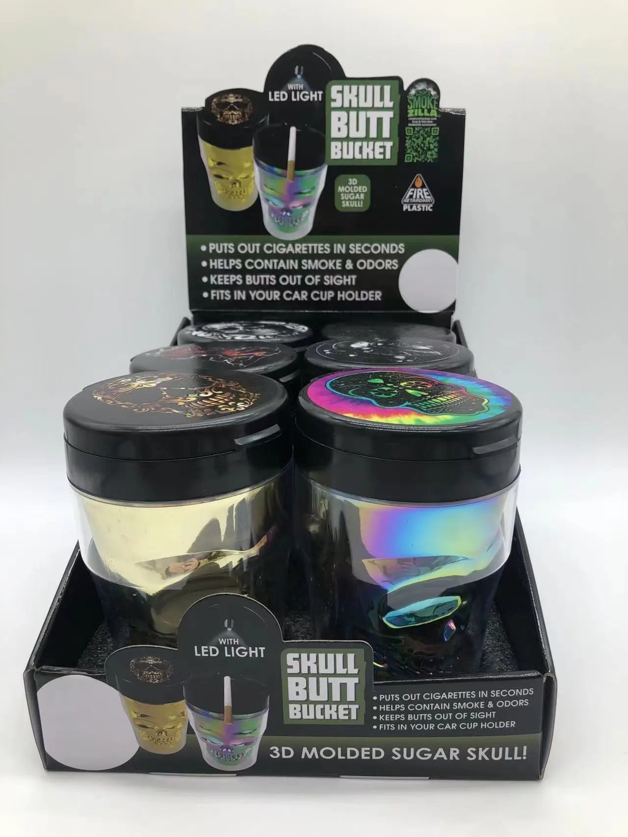 Molded Skull Butt Bucket features an LED light that comes on when you open the design-printed lid. Helps contain smoke odors and keeps your butts out of sight fits right in your car cup holder. Comes in an assortment of styles; 2 matte black, 1 rainbow, 1 gold, 1 silver, 1 pearlescent white.