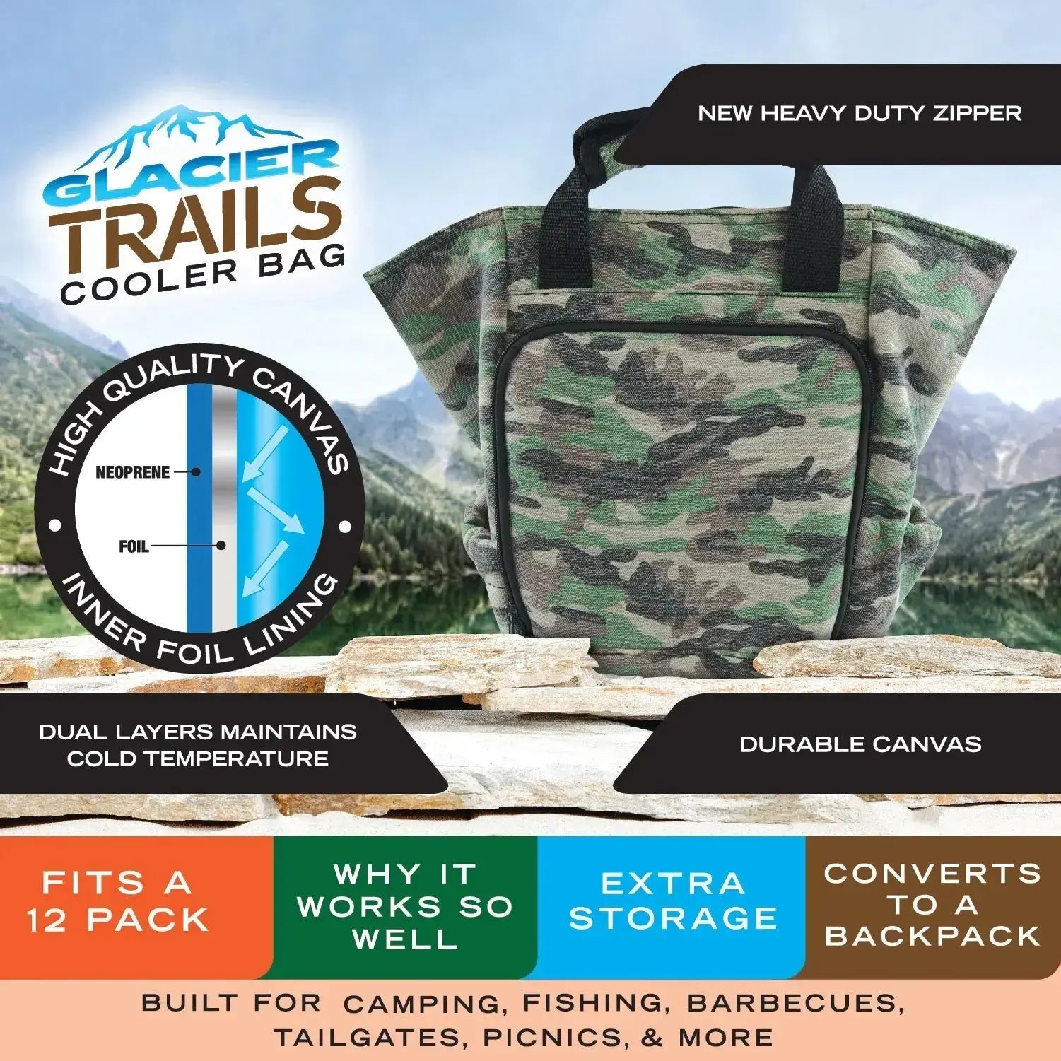 Our Canvas Cooler Bag is built from heavy duty canvas and has dual layers to maintain cold temperatures. Featuring cooler space for beverages, food, medicine; and front zipper storage for any other accessories you might need to bring along. Great for camping, hiking trails, fishing, picnics and barbecues.