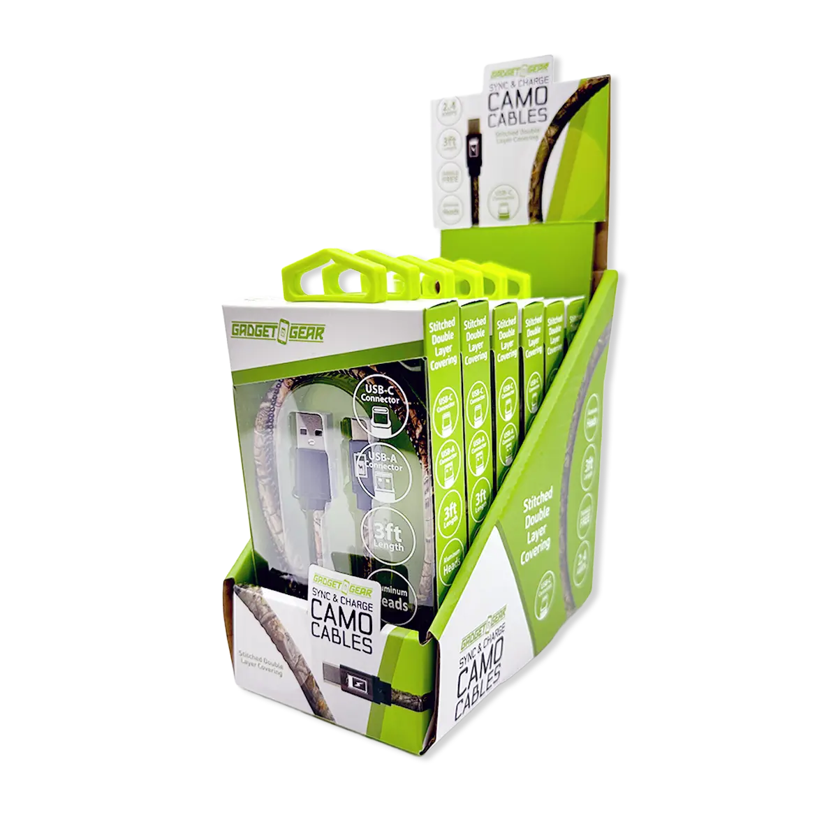These camo-themed 3-foot USB-A to USB-C charging cables combine durability and style. Featuring sturdy aluminum connectors and reinforced stitching, they ensure reliable, fast syncing and charging. Includes six cables, making it an easily accessible and ideal solution for customers seeking dependable, rugged charging accessories.
