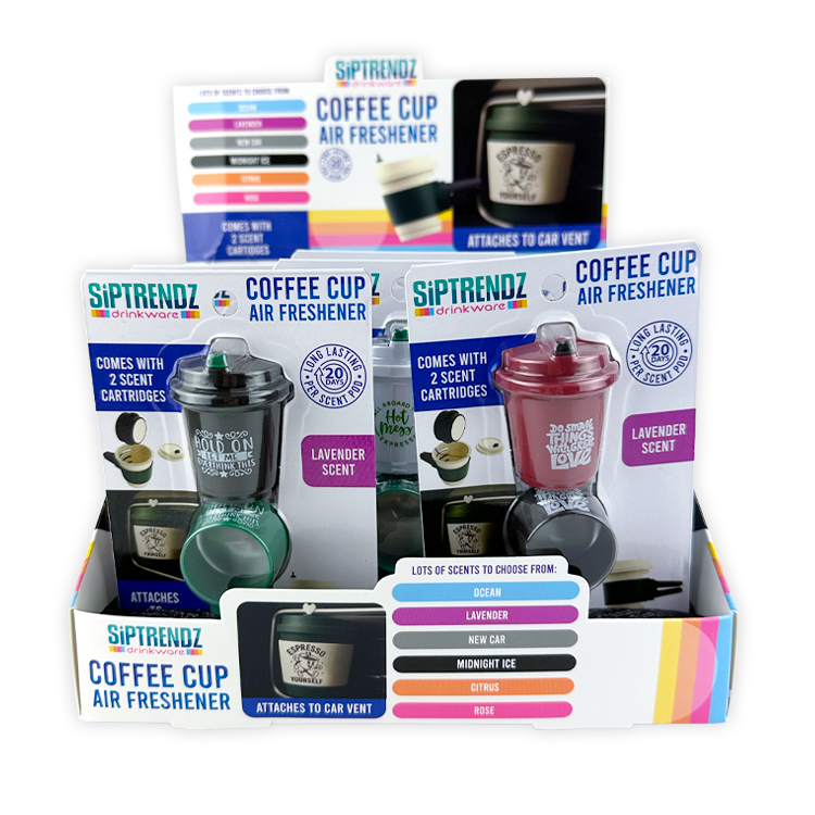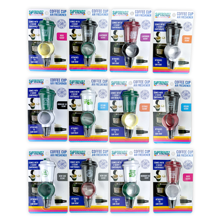 SIPTRENDZ Coffee Cup Air Fresheners transform your car into a caffeine lover's paradise. You need these charming coffee cup air fresheners. Each blister card features a unique color paired with a witty saying that speaks to car and coffee enthusiasts alike. The vent clip secures easily to your dashboard, while the back of the card showcases fragrant discs. Inside, two individually wrapped pellets stay fresh until you're ready to use them—simply open the card to see exactly how to activate your new car companion. With a funny saying printed on the band, these little gems deliver personality and aroma in one package. Display includes assorted pieces arranged in a 3-wide by 4-deep retail-ready configuration that catches eyes and drives sales.