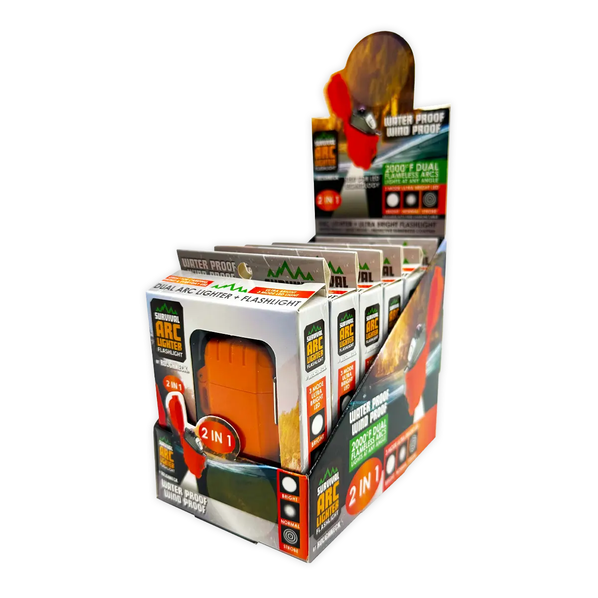 SURVIVAL ARC 2000º dual-cross lighter is a powerful, electromagnetic windproof lighter with a touch-sensitive switch and a built-in rechargeable lithium-ion battery meter that lets you know when it's time to recharge. At full charge, this powerful tool lights 50x! Includes a USB charging cord – allows you to charge using computer, car, power bank, or any USB port. Features a super useful 3-mode LED flashlight, waterproof case and rubberized coating. Weatherproof exterior. Lights at any angle. Lightweight and wind proof! Comes in an assortment of designs and styles; one(1) orange, two(2) camouflage and three(3) black. Great for camping, hiking, everyday use!