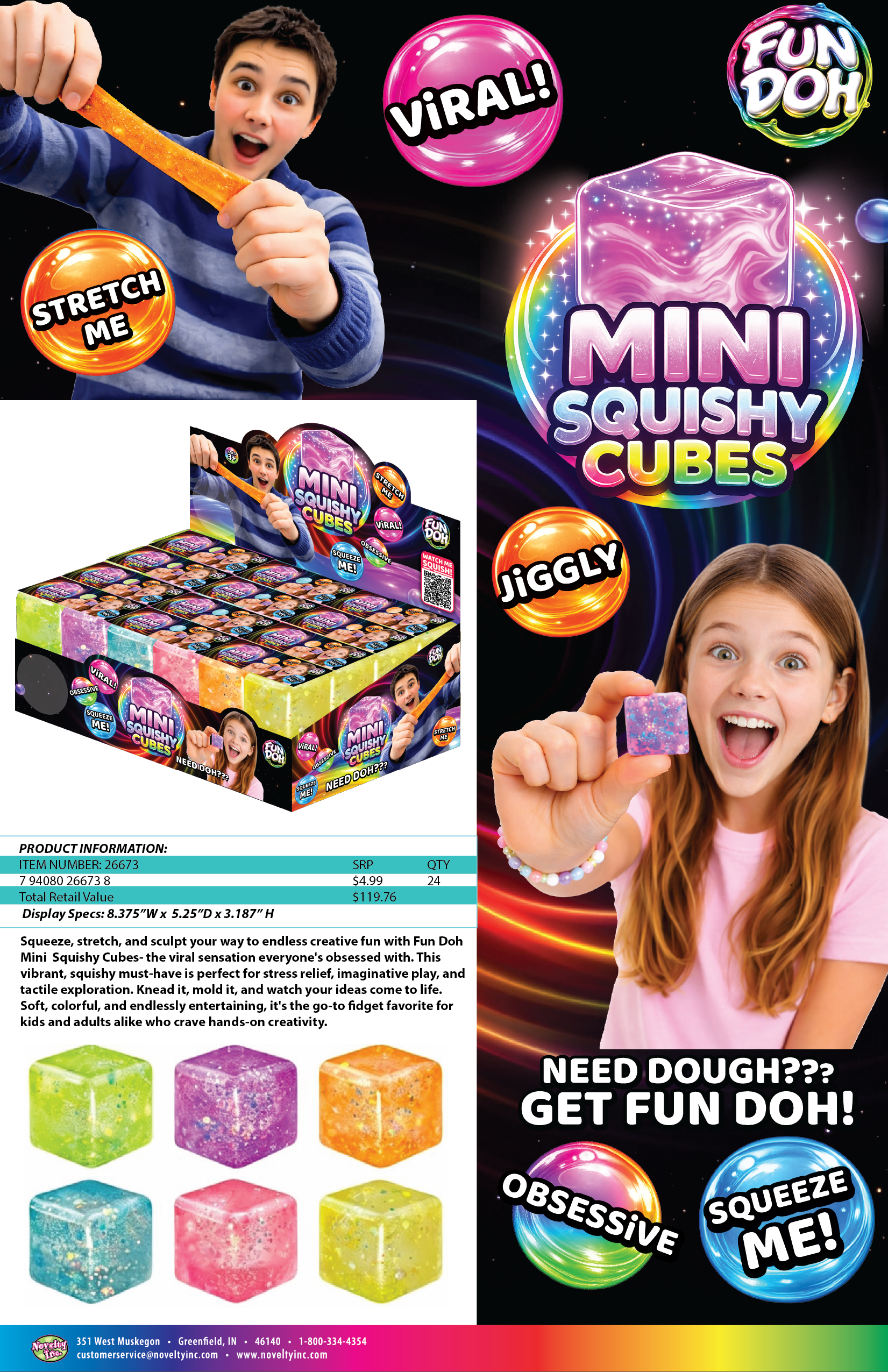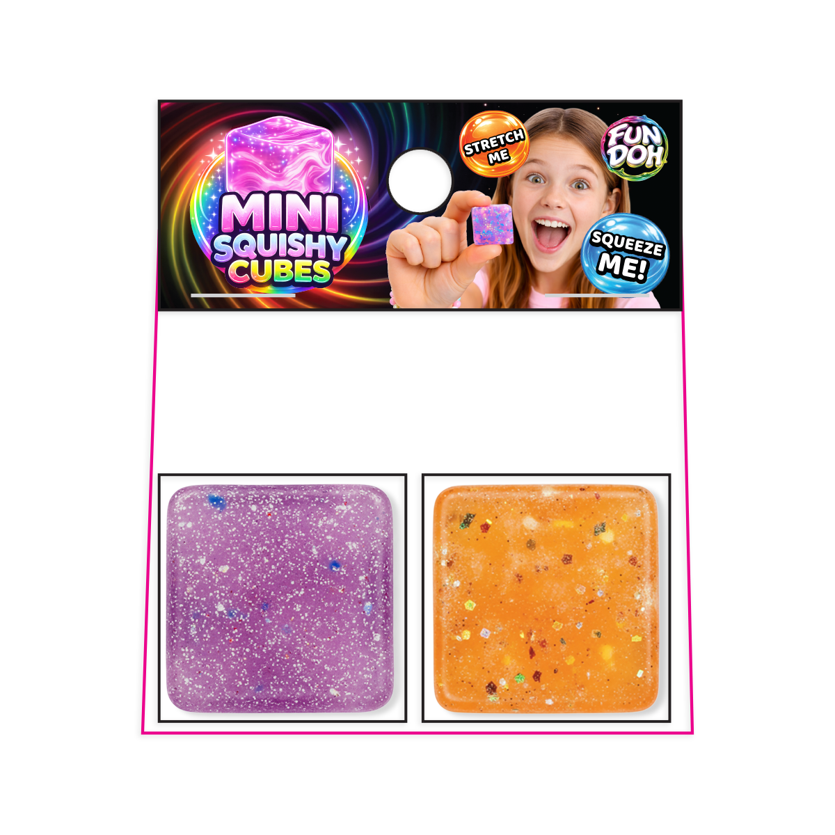 1.18" Fun Doh Mini Squishy Cubes deliver tactile fidget fun in a compact, collectible format. Each cube features vibrant colors and satisfying squeeze action perfect for stress relief and sensory play. Ideal for impulse purchases at checkout counters, gift shops, and toy retailers. Low price point with high perceived value makes these a proven margin driver for resellers. Stock quickly—squishy fidgets remain a consistent bestseller across age groups and seasons.