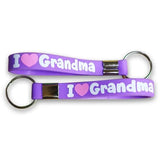 Each silicone loop key ring features an "I Heart Grandma" print and easily attaches to keys. .5" thick. Convenient loop is not intended to fit wrist.