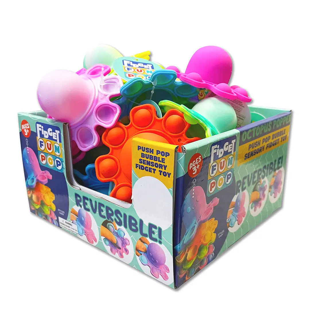 Fidget Fun Pop Octopus is a push pop bubble sensory fidget toy for ages 3+. You just cant stop the pop! Relieves stress. Safety tested. Each 100% silicone octopus is reversible with 1 side a solid color and the other side multi-color marble.