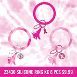 Breast Cancer Awareness themed 100% Silicone Ring Keychain Wristlet features full color designs PLUS stylish tassels and phrase charms. Individually carded.