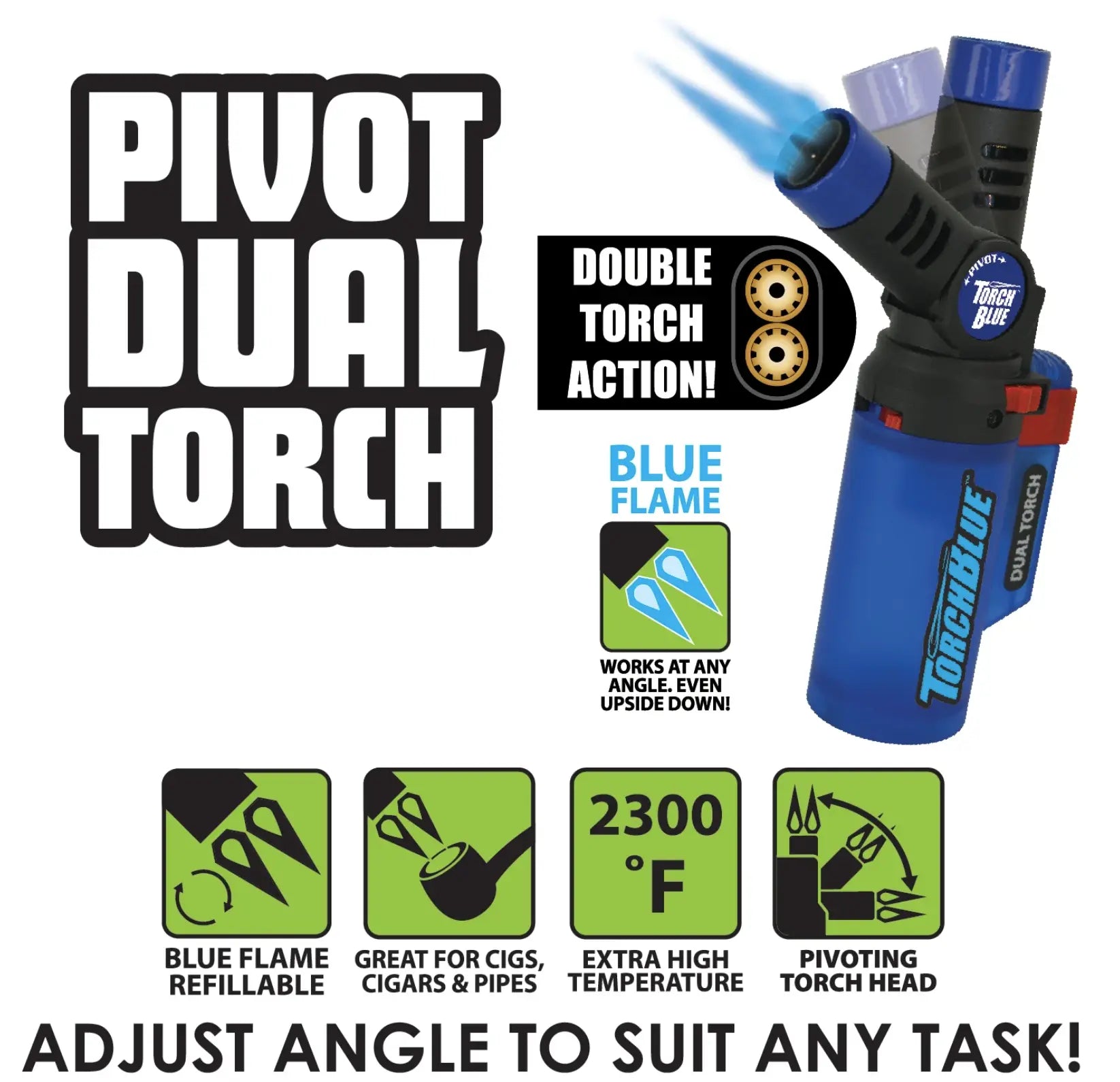 Torch Blue pivoting dual torch head can adjust to any angle to suit any task, even upside down! These high-power torch flames are 2300°, more than enough for any task. Great for camping, bronzing metal, soldering wires, flaming food, and more! Comes with a built-in safety lock. Features a soft touch finish AND INCLUDES a bottle of 18mL Butane Refill Fuel.