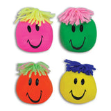 Soft, pliable smile face balls with yarn hair can be squeezed and molded into any shape! Contents: edible flour.