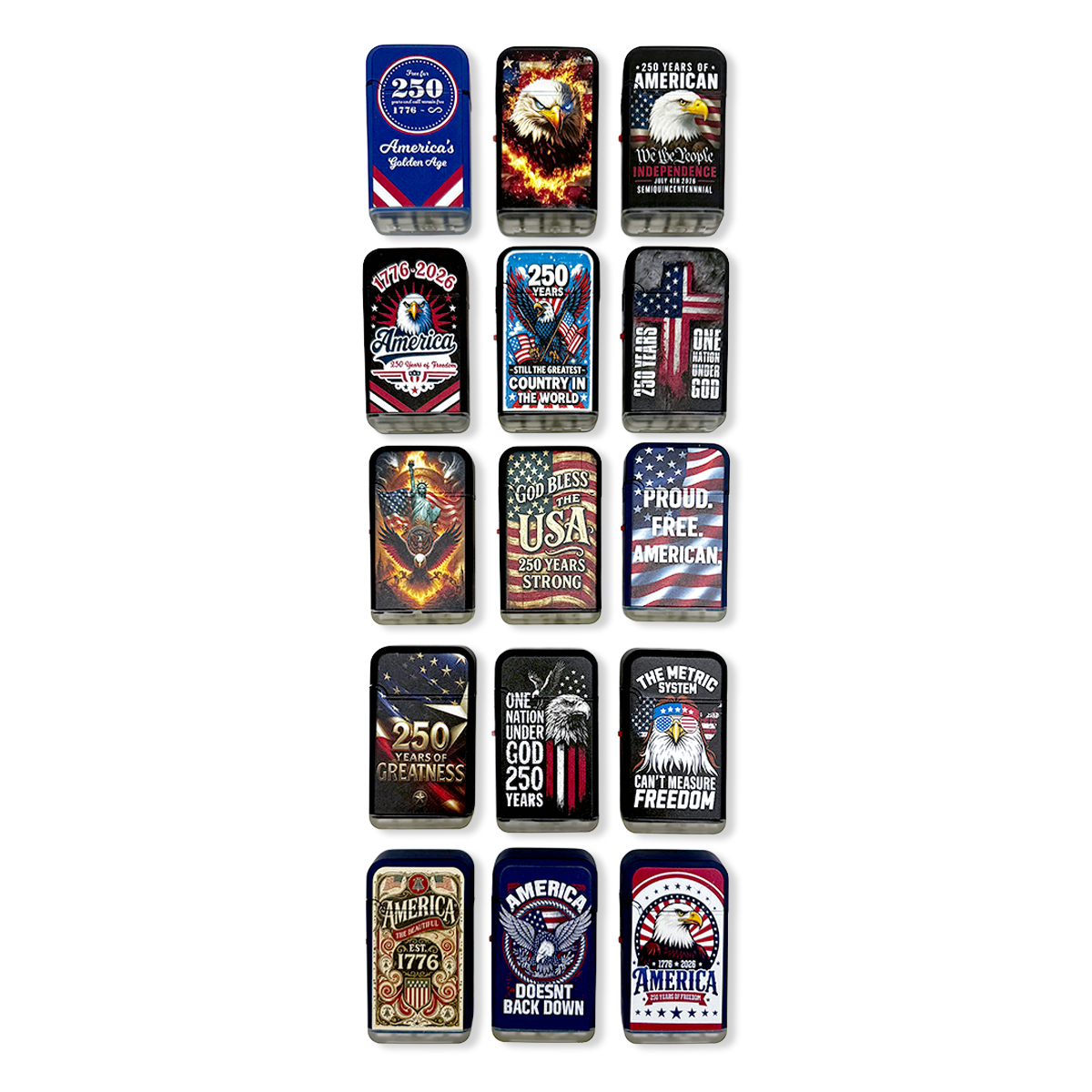 Celebrate America's 250th anniversary with the USA 250 Dual Torch Lighter. This refillable lighter features dual turbo torches with a powerful 2300°F blue flame that ignites at any angle, including upside down. Perfect for camping, cigars, pipes, and candles, it combines patriotic design with reliable performance. The extra-large fluid chamber ensures long-lasting use. Includes assorted patriotic designs.