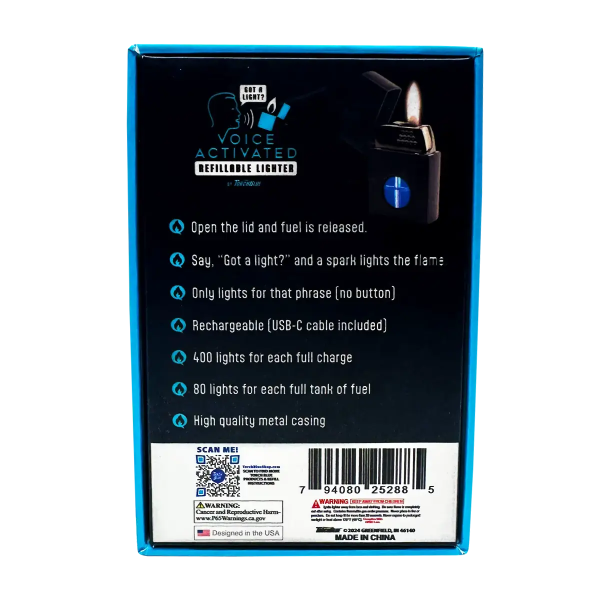 Introducing the Voice Activated Flip Top Torch Lighter. Open the lid for an easy release of fuel, and simply say "Got a light?" to ignite the flame without the need for a button. Made with a high-quality metal casing, this rechargeable lighter can provide up to 400 lights with a full charge and 80 lights with a full tank of fuel. USB-C charge cable included.